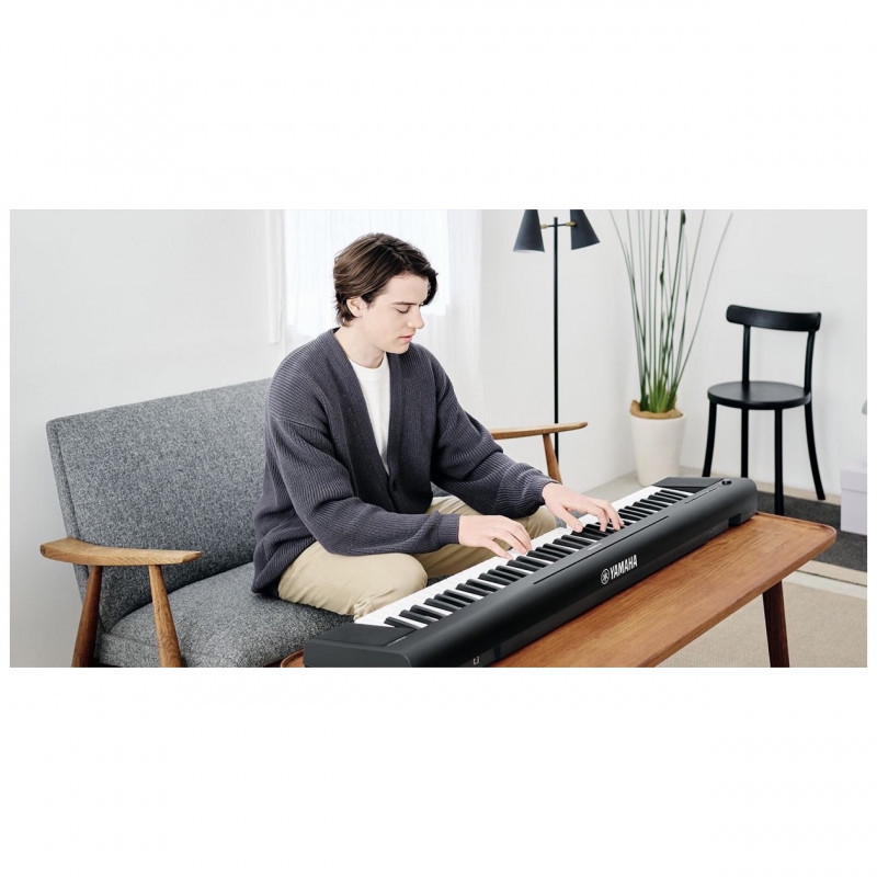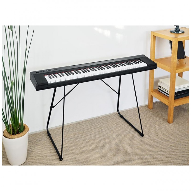Een keyboard met 76 toetsen (een conventionele piano heeft 88 toetsen) waarmee u pianostukken met meer authenticiteit kunt uitvoeren, zonder dat u veel ruimte nodig hebt. Hoewel de toetsen dezelfde rechthoekvorm hebben als die op een piano, voelt het toetsenbord lichter aan, waardoor beginnende pianisten gemakkelijk kunnen beginnen, in plaats van het zwaardere gevoel van een standaard pianotoetsenbord. U kunt bij de NP-35 ook een hoofdtelefoon gebruiken als u bang bent dat u de mensen om u heen stoort tijdens het spelen.