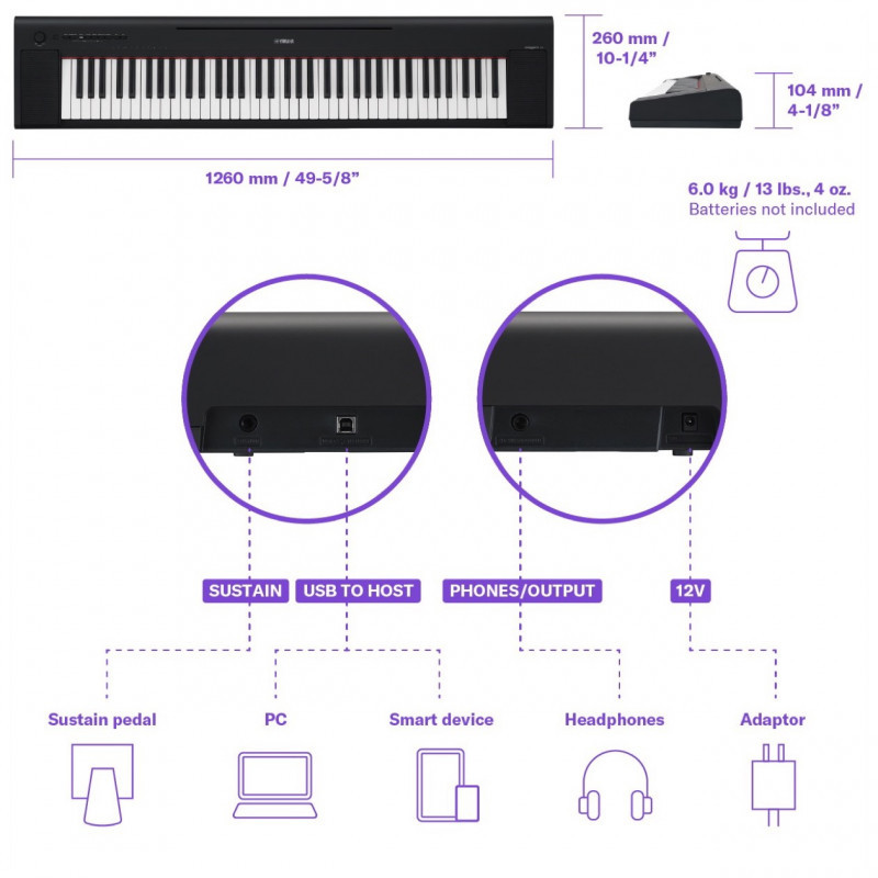 Light and compact: As the name of Piaggiero states (Piano + “leggero”), the NP-35 and NP-15 are extremely light, even for a portable keyboard, so that you can take it anywhere.