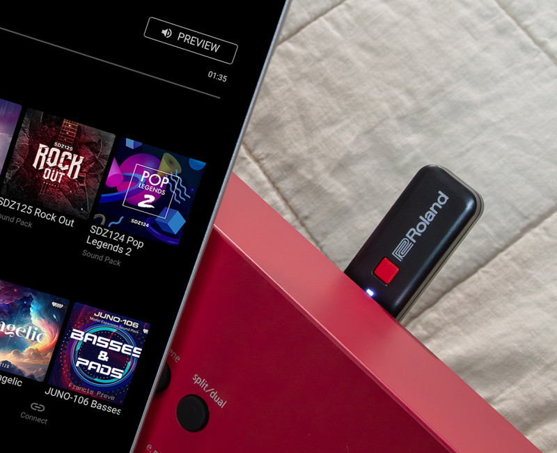 Dankzij de ondersteuning voor Roland Cloud Connect (optioneel) kun je draadloos Roland Cloud-content doorbladeren, beluisteren en downloaden vanaf je smartphone