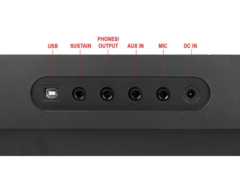Aansluitingen: DC-power, USB-MIDI, headphone / output (6,3 mm jack), input (6,3 mm jack), microphone (6,3 mm jack), pedal sustain