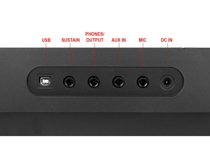 Aansluitingen: DC-stroom, USB-MIDI, koptelefoon / uitgang (6,3 mm jack), ingang (6,3 mm jack), microfoon (6,3 mm jack), pedaalsustain
