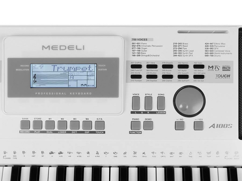 De klanken van de Medeli A100 zijn overzichtelijk in klankgroepen ingedeeld. Op deze manier is tijdens het spelen sneller een klankkeuze te maken uit het enorme klankaanbod.