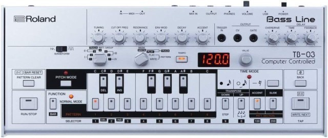 De door batterijen aangedreven TB-03 is een rechtstreekse afstammeling van de beroemde TB-303 Bass Line Synth. De lay-out en de controls bleven ongewijzigd, waardoor hij exact op dezelfde manier werkt als het originele toestel. De TB-03 klinkt ook authentiek, dankzij de geavanceerde ACB-technologie van Roland; die de hypnotiserende vloeibare grooves van dat magische zilveren doosje perfect reproduceert. Maar de nieuwe TB-03 gaat nog een stap verder: met verschillende uitbreidingen en verbeteringen die niet terug te vinden zijn in het originele toestel. Het vier cijfers tellende LED-scherm maakt programmeren makkelijker en nauwkeuriger; terwijl overdrive- en delay-effecten voor een indrukwekkende klankmuur zorgen, waarmee het publiek gegarandeerd in extase zal worden gebracht. Ook in de studio is de TB-03 geweldig: hij kan bijvoorbeeld control-informatie via MIDI of usb verzenden. De usb-poort doet tevens dienst als een hoogwaardige 24-bit/96 kHz audio interface.