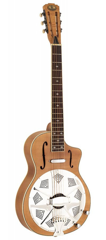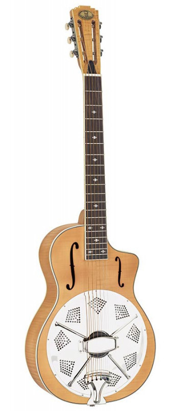 Accoustic/ electric 14 fret resonator BANTAM BLAZER SC, wooden body (flamed maple), with softcase The Royall Bantam Blazer small body resonator guitar is not only cool to look at, it is extremel...