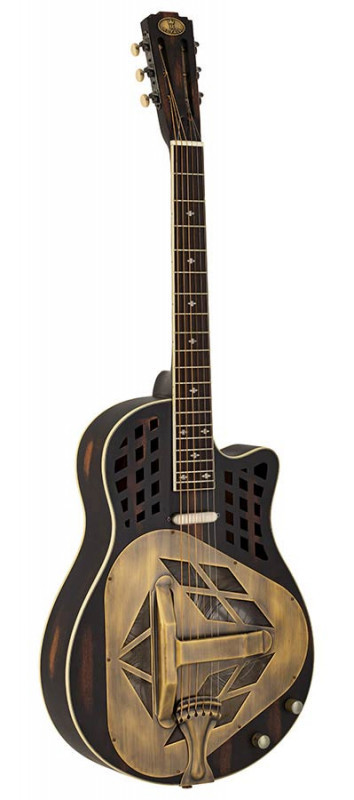 wooden body tricone resonator DELTA, 12 frets, dark sunburst finish, with softcase The tricone system in a wooden body gives you the complexity in tone from the three 6” cones which is com...