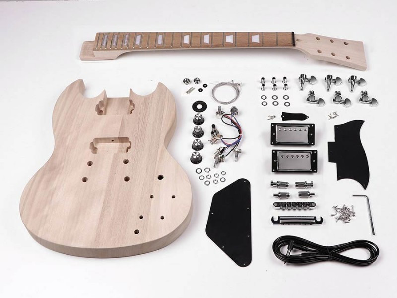 It is a slab body, so you can contour it to your own preference, very thin like the original, or a bit beefier for your personal touch. The same can be said about the squared off headstock. Let your imagination run free and form the headstock to your own vision! The fingerboard is Cites-free pau ferro, a tone wood associated with custom shop guitars. The hardware is chrome and two chrome humbucking pickups are included. This kit has a neck that needs to be glued in, just like it has been since the 1960’s. The typical tone is in your hands.