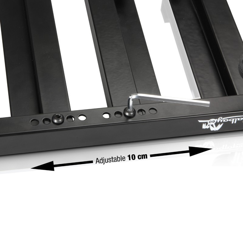 Universele aluminium pedaalbord voor de opslag van alle gebruikelijke vloer effecten. De dwarsbalken en de hoogte en kanteling van het pedaalbord individueel instelbaar. De dwarsbalken zijn al bedekt met klittenband (vlies), is een voldoende hoeveelheid van de haak riem ook inbegrepen. Voedingen en soortgelijke randapparatuur kan onder het bord geplaatst worden. Voor deze de Pedalboard beschikt over 4 praktische haken aan de onderzijde. 2 elastische banden worden geleverd - het maken van fixatie gemakkelijk!