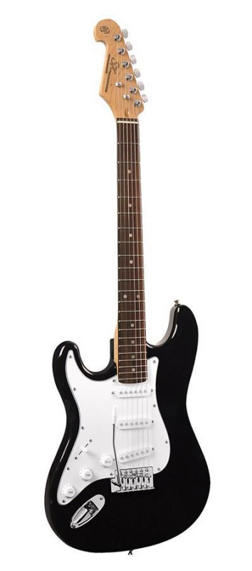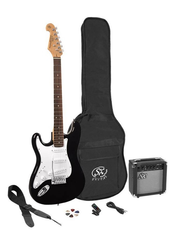 linkshandig elektrisch gitaarpakket, met versterker, tas, riem, tuner, kabel en 6 plectra, zwart
