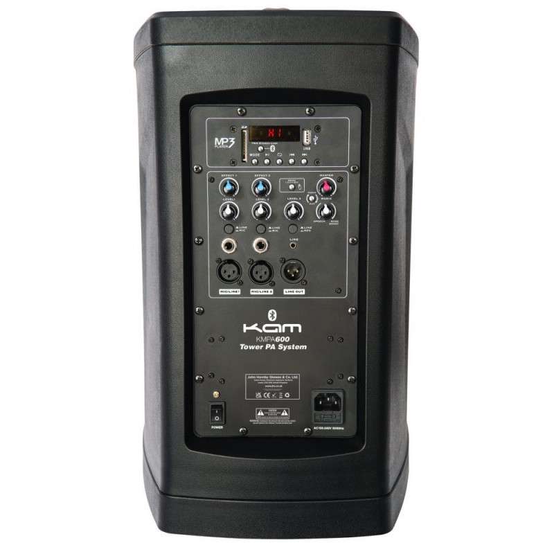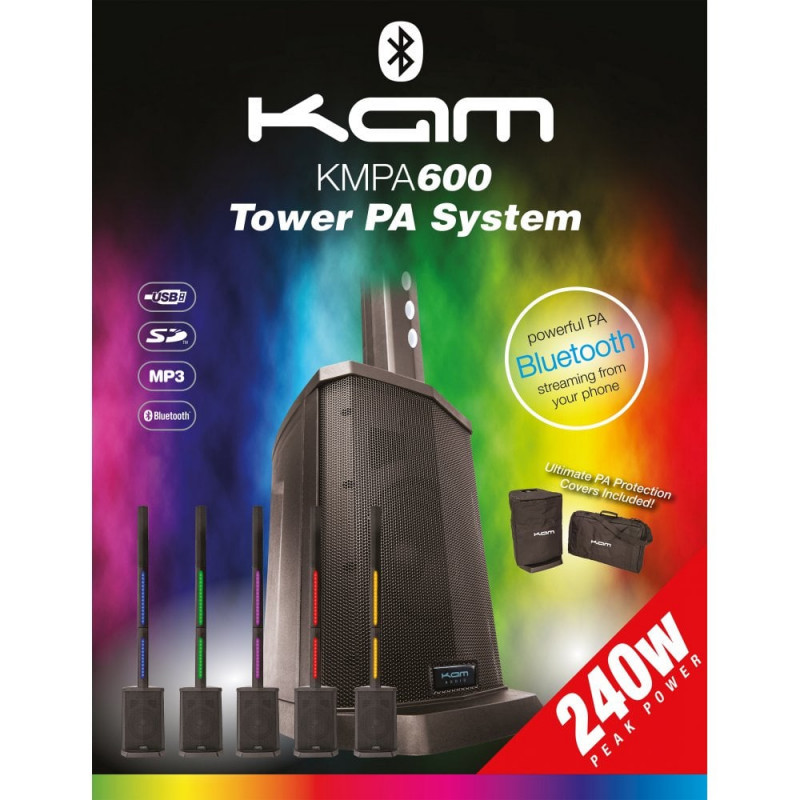 Het KAM KMPA600, 240 watt Compact Tower PA-systeem is volledig zelfvoorzienend, ideaal voor feesten, sociale evenementen en kleine tot middelgrote optredens.