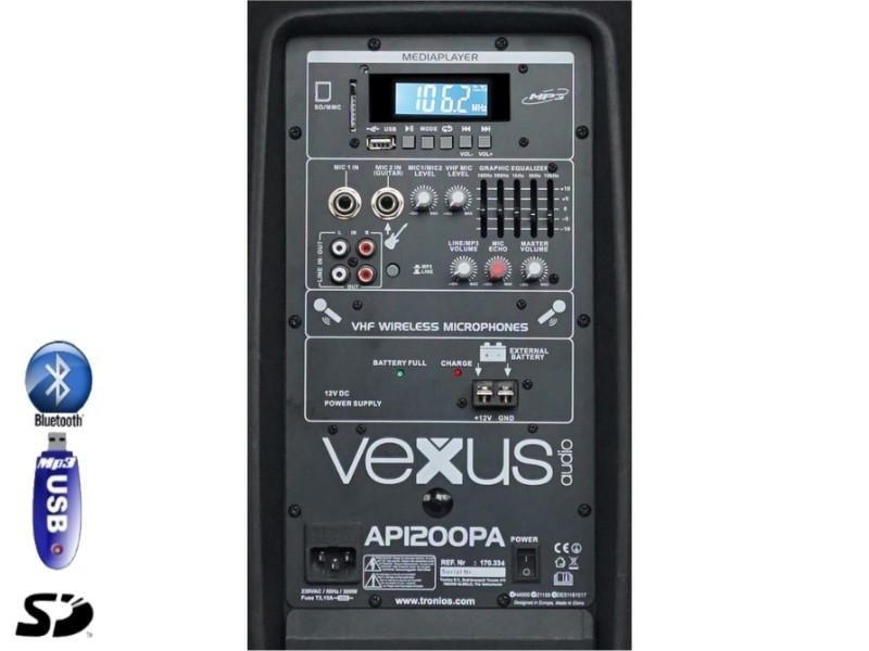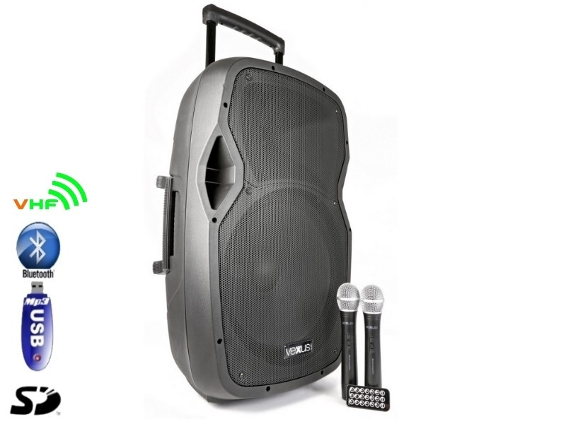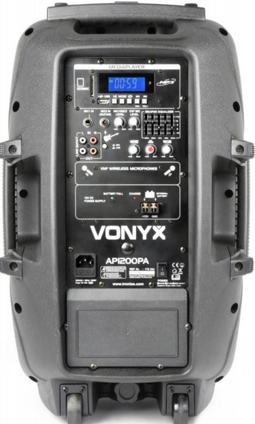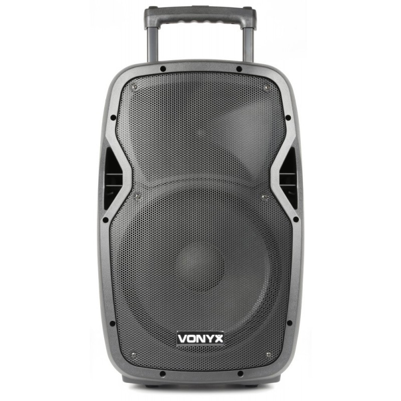Een professioneel 12" 600W Mobiel geluidssysteem met afstandsbediening, een geïntegreerde USB-poort en SD-slot voor het afspelen van MP3-bestanden. Dit "all in one" systeem is voorzien van een Blue Tooth ontvanger voor audio streaming en van 2 VHF draadloze microfoons die op verschillende frequenties werken. Werkt via de netspanning of via een 12V ingebouwde oplaadbare accu en is daarom ook buiten efficiënt te gebruiken. Komt met uitschuifbare handgreep en wieltjes. Aan de achterzijde bevinden zich 2 microfooningangen en een echo-effect voor kabelmicrofoons, AUX line-ingang, MP3-bedieningspaneel, regelaars voor toonaanpassingen enz. Het complete systeem is onmisbaar daar waar een goede audioweergave gewenst is.