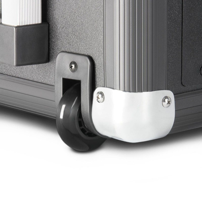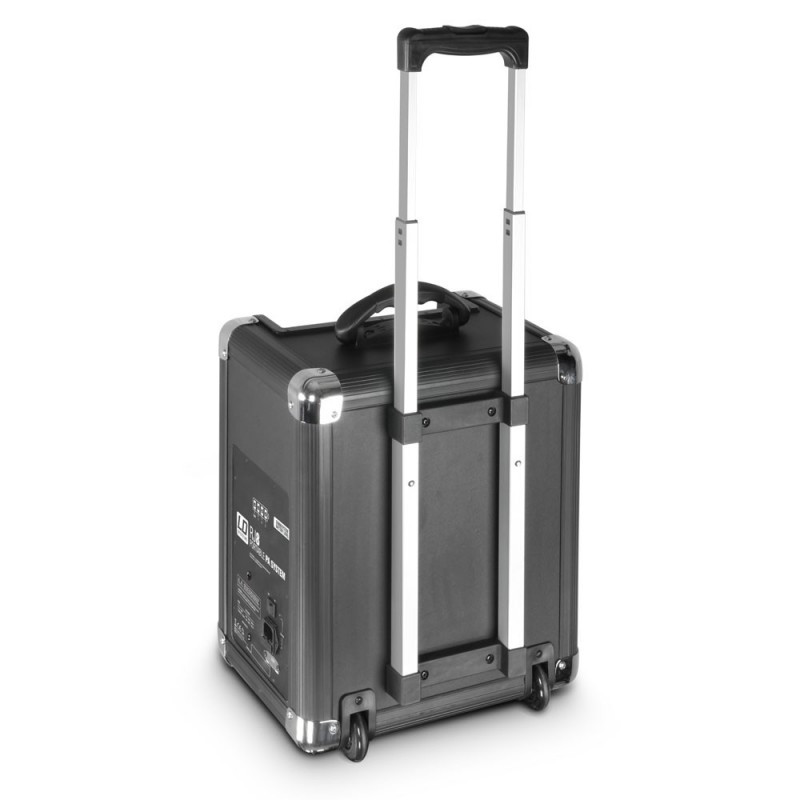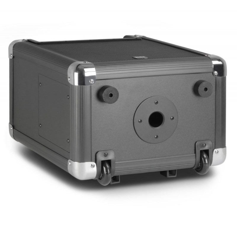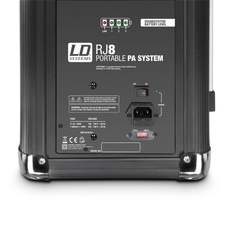 Met ingebouwde wielen en verlenghandgrepen voor het gemak van carting biedt de LDRJ8 een frequentiebereik van 90 Hz - 18 kHz en een piekoutput van 100 watt. Een oplaadbare batterij biedt tot 20 uur continu gebruik.