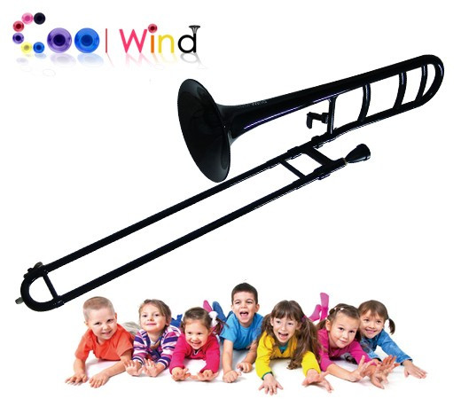 De trombone is leverbaar in het oranje, rood, paars, donkerblauw en zwart.