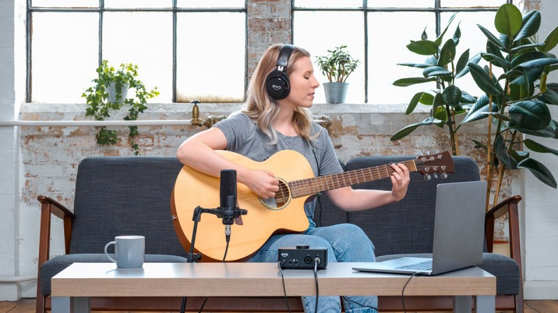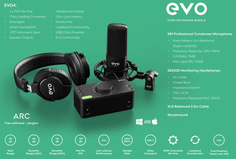 Met de EVO 4 audio-interface, SR1 condensatormicrofoon + shockmount, de SR2000 Monitoring Headphones en een gebalanceerde XLR-kabel.