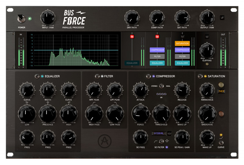Bus FORCE - a powerful original parallel processor with 4 distinct modules: Filter, EQ, Compressor, and Saturation. Your new go-to mixing plugin.