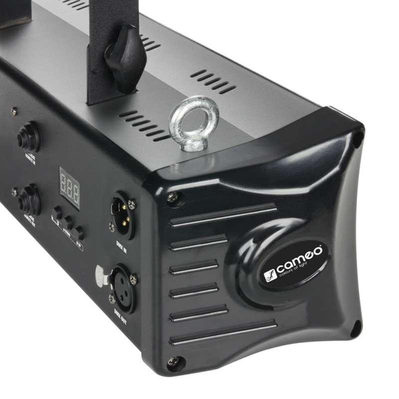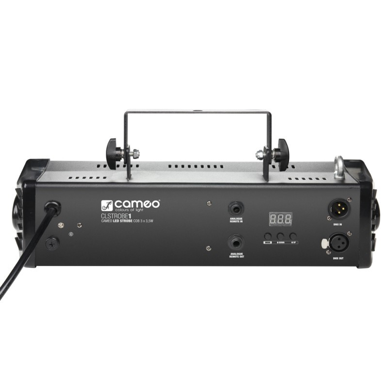The Cameo CLSTROBE1 is a high-quality LED strobe light with three 3.5-watt white COB LEDs and 80° beam angle for large area coverage. It allows for DMX, slave and standalone operation with strobe, dimmer and sound activation modes. The flash rate is adjustable from 1 to 20 flashes per second for an intense strobe effect. Mode, Value Up and Down keys and a 3-digit LED display permit easy manual control.