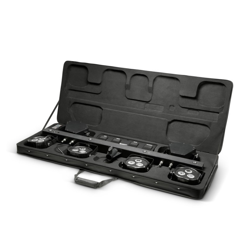 Cameo MULTI FX BAR EZ Verlichtingssysteem met 3 lichteffecten voor mobiele DJ's en bands 3 effectieve effecten in een complete oplossing met 4 super heldere LED-spots, 2 roterende LED-derbies en 4 strobe-LED's.