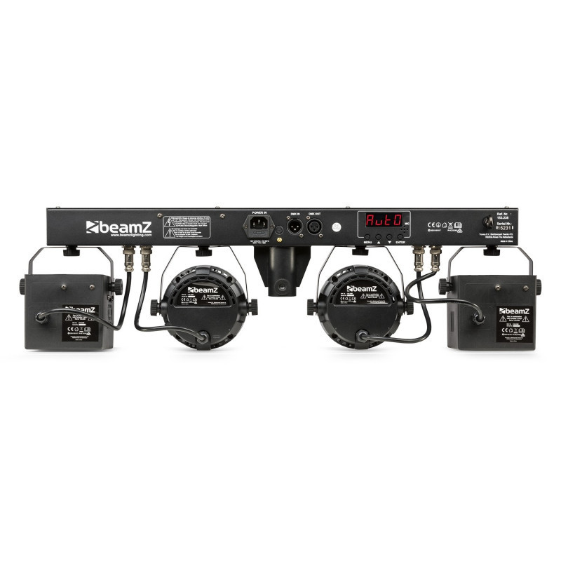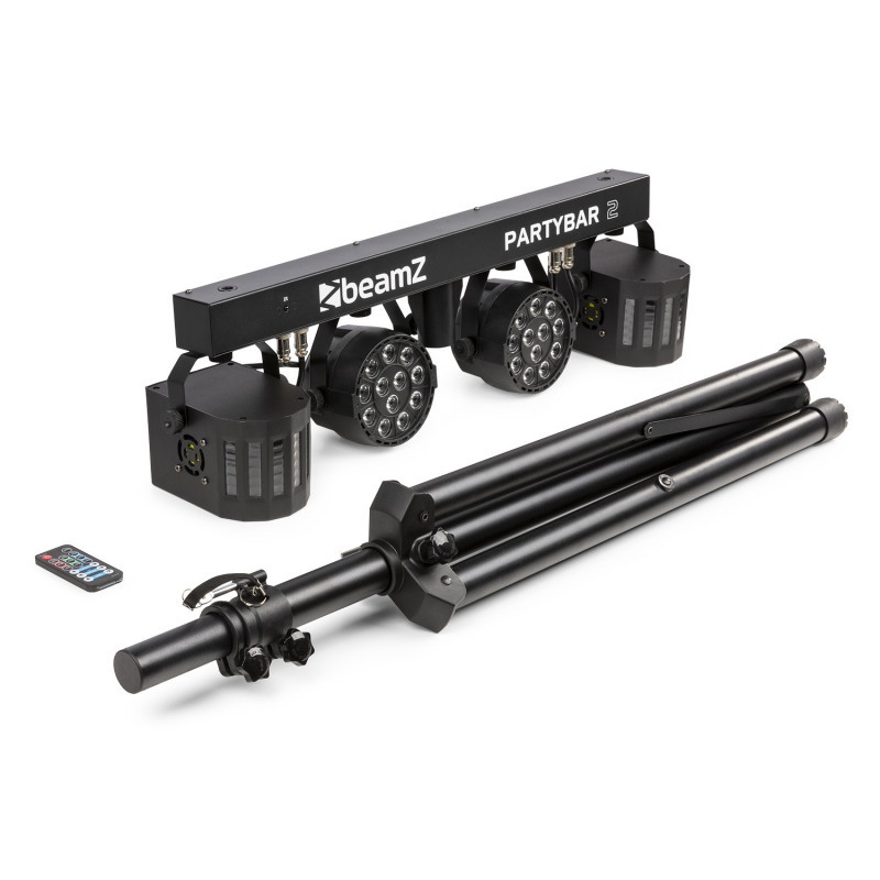 Deze Partybar2 kan eenvoudig worden bestuurd via DMX, via automatische of geluid-gestuurde programma's (selectie via het bedieningspaneel) of met de afstandbediening.